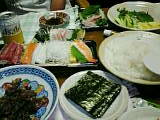 出張帰りのパパのために夕飯は 『手巻き寿司』にしました。。。パパはお刺身大好きだから イオンで手巻き寿司セット買って 牛肉を叙々苑のタレで焼いて。。。(最近お気に入りのタレ) きゅうりや大葉、かいわれ、梅肉・・・ 初めての手巻き寿司。。。 パパとムスコはテンション上がってます ムスコは牛肉にかいわれ・マヨネーズをのせたものがお気に入り きてぃらんは。。。 生ものちょっと苦手。。。 エビとイカとマグロと玉子を食べました 自分で好きな具を巻いて この組み合わせがおいしい~とか言いながら わいわい食べるのも なかなかいいもんだなぁ~と思いました