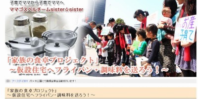 私達の支援活動のサイトが完成しました!作ってくれた従姉妹のキクミソありがとう!皆様の御協力よろしくお願いします!ママゴスペルチームsister☆sister「家族の食卓プロジェクト」~仮設住宅へフライパン・調味料を送ろう!~http://mamasis.com/
