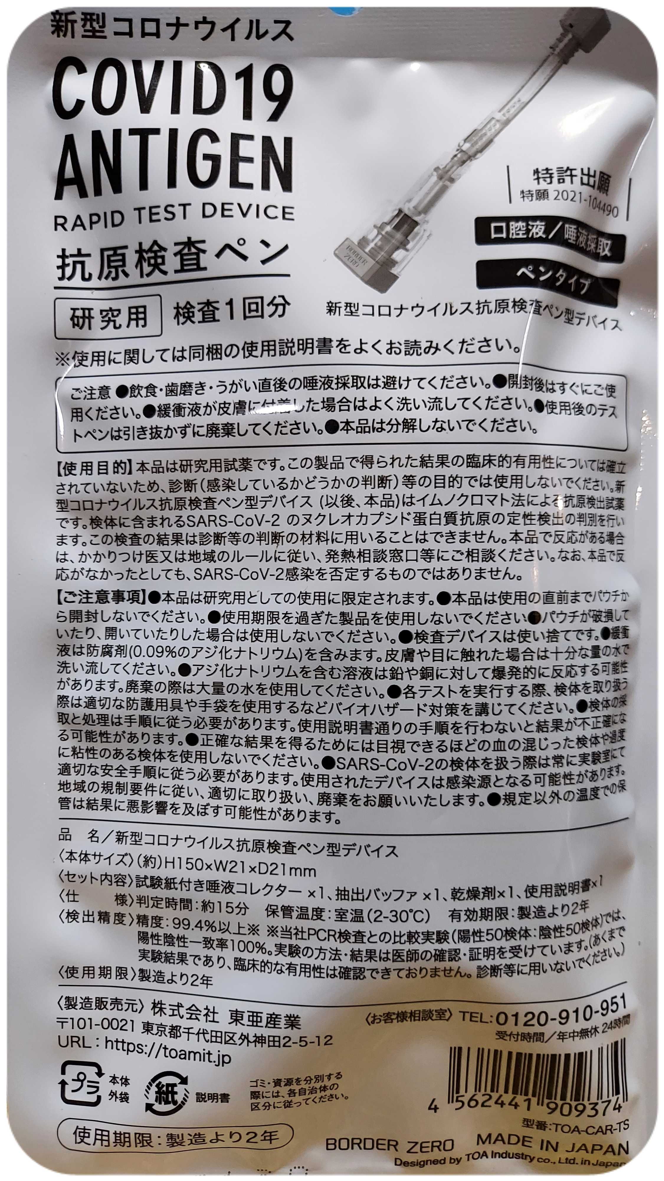 精度99.4%以上 と書いてあります。裏面の内容を読んで見てみると 研究用試薬検査キット で、 唾液による簡単な手順 により 15分程度 で判定できる。