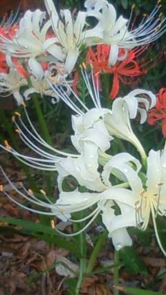 今日は少し肌寒いですね。お昼をめずらしく外食にしようと言って仕事場から外に出たら、mi-saさんも書いていらっしゃいましたが、金木犀のいい香り。。。どこから来るのかと思っていたら、お昼を食べての帰りみちで、親水公園の植込みに金木犀を発見。毎日通るのに、昨日は気づきませんでした。そして、そのわき、足元に紅白のヒガンバナが入り混じって咲いていました。これも昨日までは気づきませんでした。アップもとってみました。ケイタイなのであまりきれいに撮れていませんが。そしてもう一枚。これは少し前から気になっていたものです。よそのお宅の玄関前に忽然と現れました。2日くらい前が一番きれいでしたが、もう、少し開き過ぎでしょうか?夫とわたしはゴージャスなススキと呼んでいますが、正体は何か、ご存知の方教えてください。それにしても、あっという間にすっかり秋ですね。