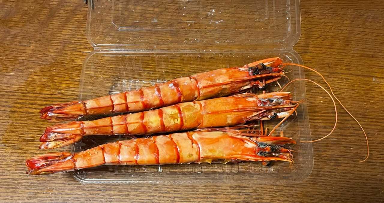 焼きエビ、ブラックタイガーです。大きさはカレースプーンくらいあるんですよ。うなぎと一緒に買ったのでお店のおじさん、100円おまけしてくれて3本1,000円です。これは明日のおかず。