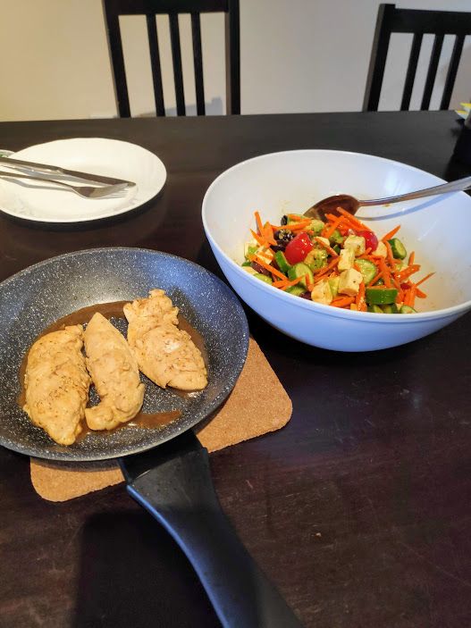 1日数時間労働のパートだっていうのに、今日は妙に疲れてしまった。家に帰ってきてから吸い込まれるようにベットに横になったら2時間近くも眠りこけてしまった!後から帰ってきた旦那さん。寝起きのくたびれた妻(きっと疲労だけのせいじゃないわ、こりゃ)を見て、かわいそうに思ったのか「今日は外食にしようか?」私は即。「大丈夫です!!作ります!!!」だって、外食高いんだもん。適当なレストランでも、1人15ドルくらいかかって、30ドルとんじゃう。自炊すれば10ドルあれば豪華ディナー、5ドルでまぁまぁOKなディナーが食べられる。チキン焼いて、フェタチーズと野菜たち切って、オリーブとドレッシングぶちこんで終わり。適当なディナーだけどいいんです。2人ですし。とても見せられるものじゃないけど、こちら。フライパンでそのままテーブルに出してますけど、何か?費用は大体8ドルくらい。明日のランチ1人分もできた。儲かった、儲かった♪さて、頂き物の台湾のお茶でも飲んでゆっくりしよう。にほんブログ村にほんブログ村にほんブログ村