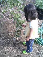 今日は、じいじ、ばあば、旦那、私、ミュウでブルーベリー狩りへ行きましたじいじの知り合いの方がやっている農園です。おととしにも行ったのですが、まだミュウは7ヶ月だったかな?もちろん、ブルーベリーは食べれずただ、抱っこされているだけでした。去年は行こうと思ったら、ミュウが熱を出して行かれず。やっと、自分で摘める年になって行くことが出来ました日曜日に予定していたけど、雨の予報だったので、急遽今日に変更。私とミュウは実家滞在中だったので、旦那に午前中に来てもらい、一緒に行きました。お昼を食べてから出発。やはり、ミュウは眠くなって、行く途中車の中でお昼寝してしまいました寝てから間もなく着いたので、最初寝ぼけていたけど、そのうち起きてみんなの真似をしてブルーベリーを摘み始めました「大きくて黒いのを取るんだよ。」って教えたら、ちゃーんと大きい粒を取っていたよ段々楽しくなってきて、「これ、おっき~いよ!!」「おっきい!」と興奮ぎみで、何度も言いながら取っていたんだけど、そのうち私たちの真似をして、パクリと食べた!!ブルーベリーなんて、好き嫌いの多いミュウは絶対に食べないだろうと思ってたけど美味しかったのかな?どんどん摘みながら、パクパク食べてました時々、「すっぱ!」と言ってたけどね(笑)本当に粒が大きくて、甘いブルーベリーでした。でもさすがに暑くて、30分くらいで終了。カゴに摘んだブルーベリーを計ってもらって、買取りしました。ちなみに、入園料は無料(会員の為)。持って帰って、ヨーグルトに入れたり、そのまま食べたりしました。あまった分は冷凍。冷凍しても、甘くて美味しかったよまだ熟してない実もついていたので、8月くらいまではできるみたい。もう1回くらい、行けるかな???ブルーベリーを摘むミュウ。小さい子でも届く高さだから、ミュウでも摘めて楽しかったみたい