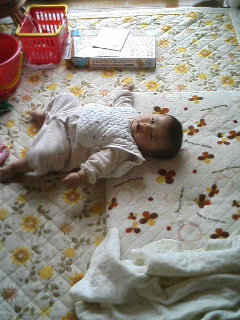 まあくん4m13d すごくたくさん動くまあくん。 抱っこしてても、寝ててもジタバタ。 足の力がとても強いの。 長座布団に頭が上、足が下(手前)に寝かせていたはずが、気付くと 90度(写真上)→180度(写真下)と足で蹴りながら、時計回りにどんどん動いていくの。 面白~い! 体をねじらせて、もうすこしで寝返りしそうです。
