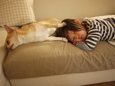 娘たちが 4月から幼稚園に通いはじめました♪はじめのうちは登園から降園まで あっという間でしたが(ママの感想)給食がはじまり バス通園でトータル6時間くらい外にいると疲れるらしく。 さっきまで グーちゃんときゃあきゃあ遊んでるなと思ったら長女がぐっすり寝入ってました人の頭は温かく 子供の髪は柔らかくて 気持ちいいみたいで・笑しきりに あんよで髪をモシャモシャやってたのですが お姉ちゃんの眠りは深い。シャッターチャンスとばかりに 私がパチリとしていたら、次女が混じってきました(こっちはタヌキ寝入り)