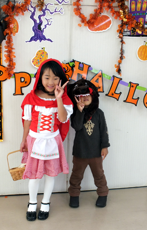 英語教室のハロウィンパーティーでした。仮装でパーティーは幼稚園までなので、娘は今回最後となります。ちょっと寂しい!今年は赤ずきんちゃんとオオカミです。事前に赤ずきんちゃんを子ども達に読んだら、息子が怖いというので「かわいくて、いいオオカミ」ということになっています。かぶりものは大人用なので大きいです すぐにとってしまうので一苦労。オオカミ用に茶色のブーツを合わせてみました。ママ達の投票によるコスチュームコンテストで今年は4位に選ばれました。3年連続の入賞!1位は去年と同じSちゃん(左端)、舞台用のメイク用品で1時間メイクし気合が入っています。Sちゃんのママは「ただのプリンセスはピアノの発表会でドレスを着てなるんだから、違うのがいいよね!」と子どもを説得したようです。私のポイントはまず弟のオオカミ(注:英語教室の生徒ではない)とバスケットの中身です。ワインに見たてたボトル(泡盛)とフルーツです。絵本だとワインとケーキだったり、ワインとお菓子だったりいろいろでした。息子が面白かったです。最後にお菓子をもらうために行列するのですが、息子が「ぼくもおかしがほしい!」というので、ずっとオオカミのかぶりものを拒否して仮装していないから、ダメだと思うよ。と言ったら、さっとオオカミのかぶりものをかぶって生徒さんに混じってお菓子の列にちゃっかり並んでいましたさっきまで「ぼくはずかしい・・・」といって何も参加せずに隠れていたのに・・・・