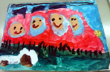 子ども達を連れて犬山モンキーパークに行こうと予定していました。お弁当をつくったものの子ども達はあまり乗り気ではなく、用意もせずに遊んでばかり・・・・なんだか私だけ張り切っているのがバカバカしくなり、「今日行くのやめようね!」と予定を変更しました。ここ数日ホルモンバランスがおかしく体調が悪い・・・自分でもノリがよくないのがわかっています 私の場合はあまりないんですが。何事も心の持ちようですね!自分が楽しくて仕方ないような生き方を自分でしていくしかないということですね。子ども達は早めにお弁当を喜んで食べて、たのしく過ごしていました。私は一人本を読んでウトウトしたりしていました。のんびりできてスッキリ!午後はお絵描き教室へ行ってきました。息子の絵 少しでも手伝うとすごく怒るので、手をだしていません。下の白い軽トラックがいい味だしています。赤い電車は名鉄電車です。獣電戦隊キョウリュウジャー スーパー戦隊獣電池セット03 4543112815118 獣電池 充電池 バンダイ 男の子 こども おもちゃ ( ばんだい きょうりゅうじゃー じゅうでんちせっと)■ 獣電戦隊キョウリュウジャー スーパー戦隊獣電池セット03上は娘の絵 持って行った息子のキョウリュウジャー獣電池を描きました。先生に教えてもらったとおり、パレットで色を混ぜながら少しづつ描いた大作です。こまかく描いたので3時間近くかかっています。 お絵描き教室では子ども達が大好きな小学校5年生の男の子(私もファン)と一緒の机になり、たくさん遊べて子ども達も大満足だったようです。予定は変わりましたが、楽しい1日でした。