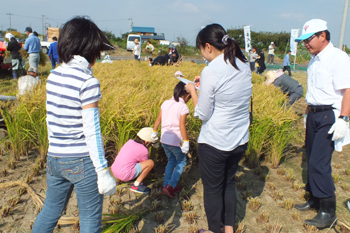 今日はなんと7家族で毎年恒例の「羽島体験プロジェクト」の稲刈りイベントに参加しました。息子の幼稚園のお友達など新しいメンバーも増え、子どもは娘とMちゃん以外みな男の子というメンバーです(赤ちゃんは除く)。娘とMちゃんは3回目の稲刈りということで、もくもくと二人で稲刈りしていたら「すごく上手ですね」と毎日新聞社の記者に取材を受けているところ。私とMちゃんママも二人のカマのなれた使い方に本当に驚きました。歳とか、名前など二人で受け答えをしているのが、可愛かったです。もうすっかりお姉さんですね。別のどこかのカメラマンに頼まれてポーズをとる子ども達去年も書いたと思いますが、アイガモ農法の無農薬の田んぼは、虫の宝庫!子ども達は、カエルやカマキリなど虫を追っかけるのに途中から夢中でした。名古屋市内は田んぼももうあまり見かけないので、私もたくさんの虫たちを見るのは久しぶり。わざわざ出かけないと虫たちも見れないとは・・・そういう時代なんですね。稲刈りの後は、子ども達参加の宝探しゲームです。今年はMちゃんがgetしました。新米でした!息子たち男の子チームは趣旨を理解できず、ただ走って遊んでいました。最後は里芋掘りです。親イモとそのまわりの里芋を掘って持って帰りました。これ、去年も食べたんですが、新鮮だからぜんぜん臭くなくて本当に美味しいんです。売っているものと全然違います。これはイベントのおまけなので、今年はあるかと心配していました。お友達にも美味しい里芋を持って帰ってもらえてすごく良かったです。今日も暑くて!暑くて! 10月とは思えませんね。子ども達が行きたくない!というまでこのイベントには参加します。