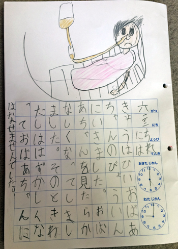 今日は子ども達を連れて、曾おばあちゃんのお見舞いに行ってきました。母がその曾おばあちゃんの妹(叔母さん)の面倒を見ているので、ずっとその姉妹を何年か振りに合わそうと計画していました。最近曾おばあちゃん(私にとっての祖母)が、病院に入院したので、チャンス到来と思っていました。どうしてかというと、病院だとお見舞いが簡単だからなんです。昔の人は体裁をとても気にされるので、叔母さんに「元気なうちにお姉さんにあったら?連れていくよ!」と言っても「そんな無理」の一点張り。要するに家に尋ねるのは、相応しくないと言うのです。そんなこんなで、いざ計画したら妹の叔母さんが入院してしまいました。最近グループホームに帰ってきましたが、「外出は無理です」と言われてあきらめることになりました。曾おばあちゃんが入院したのも意識を失い全く食べれなくなったからで、姉妹対面は難しくなりそうです。今日は春日井市の病院へ母と子ども達を連れて行ってきました。おばあちゃんは90歳です。鼻からチューブを入れて、寝ていました。途中目を少しあけましたが、焦点もあっていませんでした。特に娘は曾おばあちゃんに会うのを楽しみにしていたので、ちょっとショックだったようです。娘の日記娘の絵は栄養のチューブがリアル過ぎて、母と笑ってしまうほどでした。手にはミトンがかぶせられ、鼻のチューブはテープでしっかり固定されていました。少しの間しか病室にはいなくて、娘の洞察力にはびっくり!4人部屋皆全く同じで、どの部屋も同じ風景・・・日本の老人医療についてすごく考えさせられました。