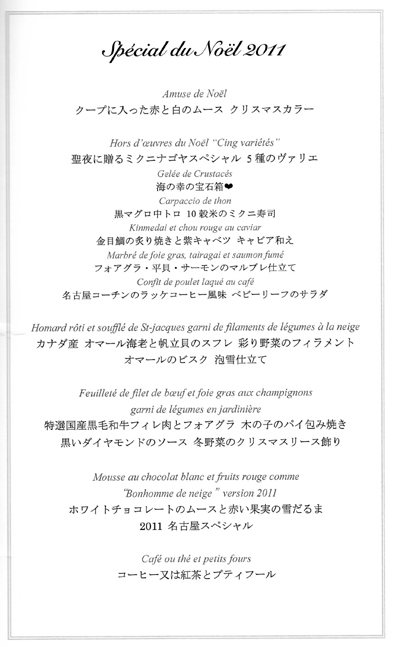 毎年恒例の結婚記念日のディナーに出掛けました。子どもが二人になっても、夫婦だけで外出できることに感謝です。いつもこの記念日にご一緒するご夫婦が秋にすでに予約を入れていた「ミクニナゴヤ」にはじめて出かけました。ちなみに娘はお隣さん家に歯ブラシとパジャマを持って喜んで出かけていきました。いつもすみません・・・ミクニナゴヤは予想通り気取ったお店で、店員さん(ウェーター?)がやたらたくさんいました。ちなみにスタッフはホテル内でローテーションしているので、「あの人この前まで中華にしたし・・」とご一緒したご夫婦に教えてもらいました。まあこのあたりはホテルのフランス料理店ということですね。クリスマスということで、店内はほぼ満席でした。意外に地味目で若い子が多かったです。みんな頑張っているのねと感じました。クリスマスということで2回転し、私たちは17:30~のディナーでした。バイオリンの生演奏もあり雰囲気と夜景はとてもロマンチックでした。まずシャンパンで乾杯!「モエ エ シャンパン キュヴェ ドン ペリニョン」グラスで1杯4500円でした。4人とも「高いわねー」といいつつオーダーしました すっごく美味しかったです!!写真は雰囲気的に撮れなかったので、メニューを載せますね。味は高級感いっぱいのお味というところでしょうか。デザートは私にとって甘すぎました。そんなことより、結婚後7回目のディナーが幸せに迎えられたことに感激です。ワインは白と赤のフルボトルを1本ずつオーダーしたのですが、最初に持ってきたワインリストがすべて6ケタのもので、ご一緒した旦那様(80代)が「これは高すぎる!」と怒ったら違うリストが出てきました。それでもすっごく高かったけど・・・私達夫婦だけなら最初から6ケタのワインリストは出てこないだろうなあ・・・。スタート時間が早いから帰宅したのが20:30でした。娘は「帰りたくないー泊まるー」と泣きオットに抱っこされて無理やり帰って来ました。私はワインも赤白グラス1杯ずつ飲んだらすっかり酔っ払い21:30には就寝・・・そして3:00起床。やっぱり元気な私です!小田さんの「クリスマスの約束2011」を見ながら年賀状のコメント書きをして過ごしました。今夜は冷えるなあと思ったらなんとホワイトクリスマスになりました。来年はどんなお店に行こうかな?