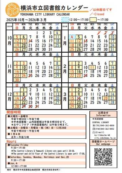 横浜市立図書館カレンダー2026年3月分までです。10/14は横浜市立図書館の閉館日です。横浜の図書館は9時半に開館です。9時にいっても開いてませんのでご注意ください。