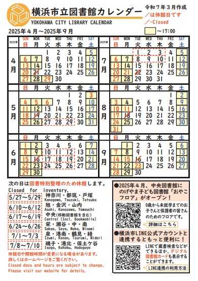 横浜市立図書館カレンダー9月分までです。横浜の図書館は9時半に開館です。9時にいっても開いてませんのでご注意ください。