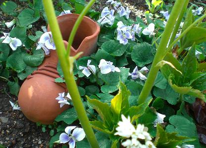 山道や境内の暗がり、土手、どこにでもある空色のスミレです。庭の端にある小さな小道に、いつの間にかこんなに増えました。夕方の暗さの中で、ほの明るいスミレが美しくて、撮ってみました。 三日続いていますが、八十五才より年上の方の話です。娘さんの家の敷地に、棟つづきの離れを建て、先日引っ越していかれました。新居のお披露目を兼ねて、招いて頂いたので、友達の運転で出かけました。日当たりの良い、気持ちよく整えられた部屋、センスの良いカーテン、白木蓮を描いた素敵なステンドグラスの立窓、こんな幸せな老後はないな、という感じです。 2時間居ましたが、その間ずっと娘さん夫婦が同席されて、コーヒー、ケーキ、アイスクリームと次々に接待して下さいました。帰る時に、近くの公園の桜が綺麗だから、と誘われて出かけましたが、そのときも、みんなで一緒でした。別に秘密の話があるわけではないけれど、あらら、という感じです。歩いているうちに、三々五々バラバラになり、一番後ろを私はその方と、並んで一緒に散歩しました。静かな声で、「2、3日前から、何だかとってもあなたに会いたかったの」と言われました。その言い方に、ぐっときて、ちょっと涙が出そうでした。若い人には、ここの文章は、わかってもらえないかもしれません。 もうやめよう、と思いながらどんどん文章が長くなってすみません。色んな老後がある中で、一番幸せそうな老後が始まっているのに、何も文句があるわけではないのですが・・・。今まで一人ぐらしで、みんなの中心にいて、誰でもが自由に出入りして、ご自分でお茶を入れて、みんなを接待してくれていた、そんな時は、もう戻ってこないのです。きっとそういうことが言いたかったのかな、と感じました。 帰り道、友達と、もう今までのように、お邪魔することは出来ないね、としんみり話しあいました。寂しいね、とも。