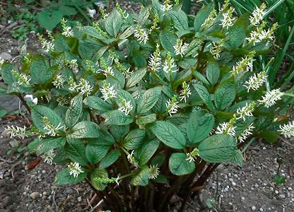 「しょうじょうばかま」と言います。想像上の動物「猩々」の赤い顔の色が、葉っぱの色に似ているから、つけられた名前だそうです。新潟県に実家がある人が、実家に帰ったときに、採集してきたと言って、分けてくれました。昔は、そこらあたりにいっぱい咲いていたけれど、今は少なくなった、と嘆いていたっけ。木陰に植えて、大切に育てています。でも、いつか、長野県に行ったときに、山の湿原にいっぱい咲いていた赤やオレンジの色鮮やかな、自生の猩々袴を見て、自然のものの美しさにはかなわないな、と思ったものです。山野草、と呼ばれるものは、やはり「野に置け」が一番ですね。