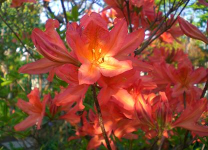 朝の光が届いた瞬間の、金色に輝くレンゲツツジです。 レンゲツツジは群馬の県花。そして赤城山はつつじの山です。5月ころから、順番に次々と種類の違うツツジが咲き続けます。レンゲツツジは、庭ではもう咲いていますが、山では、6月初旬ころ、頂を赤く染めます。 360度見渡せる頂上(鍋割山)の一面のレンゲツツジの群落。二度行ったことがありますが、忘れられない景色です。自分の足で行かなければ見られない光景、これをもう一度見たいな、と思っていました。今年は計画してくださる方がいて、願いがかないそうです。歩くのはまあ大丈夫ですが、登るのは苦手。迷惑かけぬよう、鍛えておかなければ、と思っています。