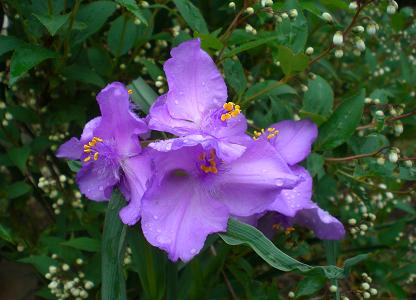 今日は雨です。先週末に来てくれた友人のことを思い出し、今週だったら雨だったね、先週で良かったな、と今思っているところです。 雨の日は、あたりも一段と静かで、鳥の鳴き声だけがしています。傘をさして庭に出て、ムラサキツユクサを撮ってみました。雨に清められ、花弁の紫が冴えています。花芯の黄色も素敵。 この自然の配色の妙はどんなデザイナーもかないません。頭上には藤の花、足元には十二単、都忘れ、ヒイラギ草、オダマキ、と紫色の花が次々に満開を迎えて、うっとりです。紫の世界は、雨が似合いますね。 でも、シトシトと降る雨がいいな。写真の背景は、ウツギの花のツボミです。とても好きな花です。咲くときれいですよ。