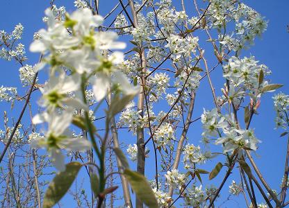 植木センターへ付き合ってほしい、と言われ、出かけました。この友人と私は、植木の趣味がとてもよく似ていて、「あ、これいい!」と指さすものが、殆んど一致しています。だからお互いに、この人がいいと言えばいいかな、と言うところがあります。でも、今日は、はっきりと目的の木が決まっていて、数ある中から、好みの形をえらぶことが大事なのです。それは、くろふねつつじ、という名前です。ほのかなピンクで、花弁が大きく、私も欲しくなるツツジでした。でも、私の庭には、もう全然スペースがありませんので、諦めました。車の後部から、寝かせて積み込み、助手席の窓に届く大きさです。私は、つつじに助手席を譲り、運転席の後ろに座って、花びらがふるふると揺れるのを見ながら、いいのが選べて良かったね、と思い、友人の庭に植えられた姿を想像しながら帰ってきました。 植木センターで目立っていたのが、今日の写真のジューンベリーの花です。白い花は、なかなかうまく撮れなくて、今朝、脚立に乗って撮ってみました。友人の庭でも、私の庭でも、真っ白な花をつけ、それは清楚に咲いています。六月には赤い実をつけ、十一月には紅葉が素敵で、一石二鳥どころか一石三鳥のおすすめの木です。