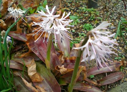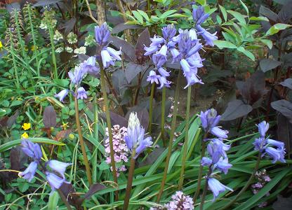 球根の植物って本当に不思議です。自分で歩いて行って、どこにでも顔を出して、前からそこにいるように、澄まして咲いています。このツリガネスイセンも、好きな場所を選んで、勝手に咲いています。なんでかな。種なら風に飛んで、思いがけない場所に咲く、と理解できますが、球根の植物が、動くことが信じられません。友達の間では、モグラが運ぶのでは、という意見が大方です。いい加減ですが。 始めの写真は、紫のツリガネスイセン。二枚目はピンクです。私が意図した訳ではないのに、ピンクの十二単の中に、たまたまピンクのツリガネスイセンが咲いているのも、不思議です。白もあるんですよ。同じ花が色を違えて、出てくるのも、不思議ですね。
