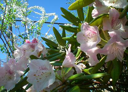 庭の花たちがどんどん開き、そんなに一時に早く咲いてしまわないで、と言いたくなります。忙しい日々を過ごしているうちに、石楠花がまだツボミもありますが、黄色くなって、散ろうとしているのもあるのに気付きました。あら、大変。 ブログに登場させてあげなくては。西洋しゃくなげとちょっと違い、優しい色合いで、ふあっと咲いています。今日は風がつよく、ふわふわと揺れてなかなかうまく撮れません。 石楠花の向こうに咲いているのは、しじみ花。雪柳の散り始めるころ、選手交代のように、咲きはじめます。葉っぱはとても雪柳に似ています。丈高く、しだれるように咲き、とても可愛い花です。花がしじみの身に似ているので(確かに)、ついた名前のようですが、いかにも可哀そうで、前から気にいりませんでした。友人が、園芸店で「ブライダル・リース」という名前で売っていたと言います。調べたら、英名だそうで、急に格上げされたような名前です。
