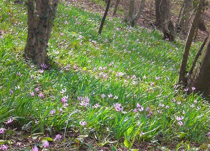 金曜日の午前中に、カタクリの山へ行ってきました。可憐な紫紅色のカタクリの花が、小高い小さな山全体を覆っています。コナラやクヌギの落葉樹の木々を通して、木漏れ日が射し込み、スミレやアズマイチゲが一緒に咲いていて、それはそれはとても気持ちの良い素敵な林です。写真のカタクリの花と一緒に緑色に茂っている葉は、キツネノカミソリです。 斜面を登り、展望台に出て、反対方向にぐるりと下りてきました。昨日とは打って変わった穏やかなお天気の中を歩いてきました。午後からは二泊で友人宅へ出かけます。なぜそんな忙しい日に、わざわざ山へ行くのでしょうか。仕方ないのです。帰ってきてからでは、カタクリの花の最盛期は過ぎています。やはり、今が大事、なーんて思いますけれど。それとも、ただの遊び好きなんでしょうか。