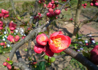 もう十数年前のことですが、お隣のご主人が、自分の家のボケの木の横に出た子株を、うちの庭に植えてくれました。一本の木に、紅白の花が咲く、それは見事な木瓜の木です。 落葉樹は、冬の間に移植するのが普通だけれど、「ぼけ」だけは、秋に植えるといいんだよ、とウンチクを語りながら、「あーあ、人間ぼけたかないなあー」 とおやじギャグをとばして、まだ元気だった主人ともども、皆で笑っていたものです。 うちに来てから一年目は、紅白で咲きましたが、それ一回きりで、毎年、赤の花しか咲きません。こういう現象を先祖帰りというそうですが、白の遺伝子はどこにいったのかしら。