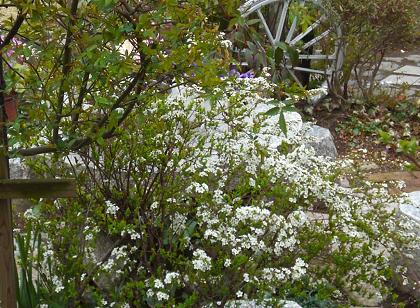 未明からすごい風が吹いています。群馬は赤城山からの風が強く、赤城おろしと言われて有名ですが、今にも折れそうなほど、すべての木が揺れに揺れています。白い花をつけた雪柳の四方に伸びた枝も、頭を振るように、揺れています。向こうに見えている車輪は、壊れた自転車のタイヤを白く塗ったものです。自分でレンガをコツコツと敷いて、小道を作ったりして、楽しんでいます。 毎年見に行くカタクリの山で、カタクリが素晴らしいとの情報が・・・。太陽が射さないと、カタクリは花を開いてくれないので、美しさも半減。お天気が晴れなら、今日見に行こう、と話し合っていましたが、この風では、山へ登るのも怖いようだし、落ち着いて見ることもできません。明日は午後から二泊で出かけます。帰ってからではもう遅いし、どうしようかな。午前中に行ってみようかな。花の見頃と、時間の追いかけっこです。