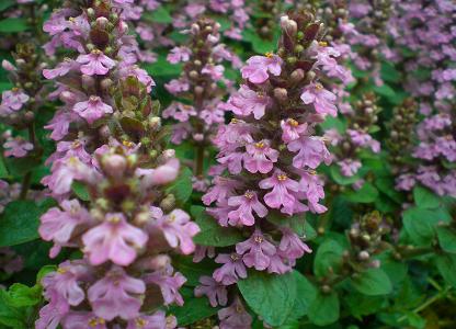 花びらが階層になって、幾重にも重なる様子を平安時代の十二単にたとえて、名づけられたようです。 うちのは園芸品種のアシュガといわれるものです。とても丈夫で、放っておくと、どこまでも地面を這って広がっていきます。20センチくらいの丈に伸びて、みんなで背伸びするようにして、群生している様子は、とても美しいものですよ。他によく見かける紫色も、薄紫色も咲いています。この写真のピンクは、大抵の見た人が欲しがるので、今までに何人の方に分けてあげたか分らないほどです。そんなにしても、すぐに増えて、驚くほど丈夫です。 庭を見ていると、本当にほっとするし、癒されます。丈夫で美しい植物達が、あちこちの家で増えてくれれば嬉しいな。