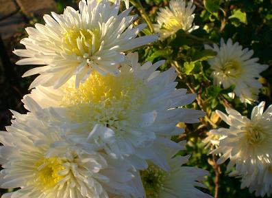 朝日に輝いて、白菊がピカッ~と、あーきれい!この白菊は、もっと年末に咲く冬の菊です。お正月の飾りにちょうどいいのですが、今年はもう咲いてしまいました。 雨がびしょびしょと降る昨夜の七時ころ、ご夫婦でお直しを持ってこられました。明日の朝八時までに、お願いしたいとの事。ここなら無理を聞いてもらえる、と教えてもらって来たとのこと。大丈夫ですよ、と引き受ける。ちょっと夜なべ仕事をすればいいだけのことです。申し訳ない、と何度もお礼を言われた。干しイモを頂いた。小さな、小さな仕事。でも、お金頂いて、お礼言われて、お土産頂いて、こちらこそ有りがたいなあ。