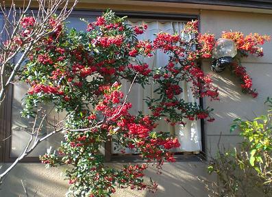 窓辺のピラカンサが、新芽をびょんびょんと伸ばして、屋根にまでついています。とても見苦しい。 暖かな陽射しの今日、剪定するぞ!外からは高枝バサミで、家の中からは、出窓に乗り、のこぎりとハサミを使い、剪定しました。 すっきり!右側は、赤い実が、外灯に架かっていて、この景色は、自分なりに気に入ってます。これ以上は、もう伸ばしません。 左側は、ガラス窓の直角を伝い、ぐるりと向こうまで伸ばしていく予定です。この状態で、春は小さな真っ白い花が、木を覆うように咲き、とてもきれいです。いつも頭の隅には、植物の春の状態を想像しています。これはこういう風に仕立てていこう、とか、春を待っているとか、そういう日々も楽しいですね。前面の、葉をすっかり落とした木は、モミジです。