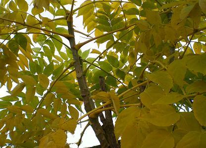 春の山菜の天ぷら、おいしいですよね~その代表、山菜の王様は、タラの芽。庭つづきの小さな畑の端っこに、タラノキが植えてあります。タラノキには、とても鋭いトゲがあります。このトゲが嫌で、一昨年、根っこから撤去して、「トゲなしタラ」と入れ替えました。 2本だけなのですが、節々に芽がついて、収穫量が多い、という優れもので、家族で食べるには十分です。夏にかけて、どんどん成長して、3mくらいの丈になりました。縦横に張った葉が、いま、黄葉しています。 とってもきれい!今までのタラノキは、黄葉の前に枯れていたので、こんな美しい黄葉は始めてです。 落葉したら、低い位置で切り、越冬します。また、来年、おいしい天ぷらを食べさせてね。