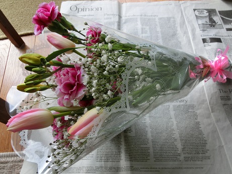 お客さんから花束を頂きました。嬉しい~!忙しい時、生花店のお手伝いをしている方です。庭に花の無い季節、この華やかな色たちがことのほか、目に沁みます。カーネーション、チューリップ、フリージア、カスミソウ。女性は、本当に花束が好きですよね。花束の忘れられない思い出があります。それは、何十年も前の話になりますが、娘が生まれたときのこと。始めて病室に主人が来たときに、大きな花束を抱えていたんですよ。私はとても若くて、同室の皆さんが、わあ~、いいわね~、と言って下さるのが、恥ずかしくて、嬉しいとは思いませんでした。年々、年を取るにつれて、いつも、思い出すのです。あんな昔に、奥さんに花束を上げる男性は少なかったと思います。お父さん、おしゃれだったね~、ありがとうね、と。今、花束くれたら、嬉しくて、きっと抱きついちゃうよ(笑)庭のローズマリーと水仙を加えて、剣山で活けてみました。チューリップは花瓶にまとめてみました。いいなあ、嬉しいな。祝合格! 孫のいっくんが希望大学に合格しました~!11時発表で、今、聞いたばかりです。娘の声も孫の声も弾んでいます。これからの世の中、どう変わっていくのか予想も出来ませんが、一応の目標があるようなので、この4年間を大切に学び、青春してもらいたいです。最初の一歩に躓いて欲しくないな、と思っていたので、本当に良かったです。花ブログランキングに参加しています応援のクリックをよろしくお願いします。