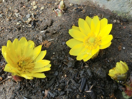 福寿草が次々に開花しています。葉は花が終わってから出てくるので、今は花だけが地面にポンと、まるで黄色の折り紙の花が落ちているようです。福寿草のツボミを見ると、まるで人間が合掌しているようだな、と思います。命を有難う、と謙虚に祈っているようです。ふと見ると、レンガの小道を挟んだ反対側にも一輪咲いていました。離れた場所に自然に出てくるはずはないので、きっと私が株分けしたのでしょう。まわりには、まだ三芽ほどが出ています。自分で株分けしたことをすっかり忘れて、ひえ~っと感動してしまいました。風邪からきた体調不良で、血液中のCRP(よく分かりませんが)の値が下がらず、もう十日以上、まだ毎日点滴を受けています。Y先生の医院では、10人以上の看護師さんがいて、先生の教育のせいなのか、それはそれは皆さんが揃ってとても親切です。今日も点滴の準備をしながら、「すっかり長引いてしまったですね」と、「普段、あまり縁が無いから辛いでしょう? 春に蜂に刺されたあの時以来ですものね」と、若い看護師さんが言います。あっ、そうだ、そんなことがあったっけ、と思い出して笑ってしまいました。庭で蜂に刺されて、Y先生のところへ飛び込んだのだったっけ。不名誉な記憶だわ~(笑)個々のことを、覚えていてくれるのね、と感心です。 お客様から、頂き物のおすそ分け、と伊予かんを頂きました。体は全然元気なので、買い物に出ようと思えば出れますが、一週間に一度、ご近所の人と一緒に、コープからの食材を頼んでいるので、外出しなくても、不自由はしません。そこにある材料で、食材を買い足さず、工夫して食事を作ることに、無駄がないなあ、とすごく喜びを感じています。ウフフ、変ってる?いまも、お隣さんがほうれん草の真っ青に茹でたのを持って来てくれましたよ。感謝、感謝。花ブログランキングに参加しています応援のクリックをよろしくお願いします。