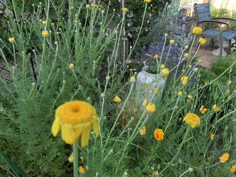 ダイヤーズカモミール。これは朝の写真です。みんな花びらを折り畳み、まだ眠っていますよ。平凡な黄色い花ですが、背が高く、しっかり立ってくれて、それらが一斉に揺れている姿は、とっても素敵です。深い切れ込みのある葉は、涼しげです。太陽と共に開花しました!多年草なので、冬も残っている株から新しい芽がどんどん伸びるころに、株を分けて、あちこちに植えておきました。どれもよく成長して、千鳥草、カスミソウなど、どんな花ともよく合っています。今年、ネットで検索していてはじめて知りましたが、黄色の花は、染料になるそうです。ミョウバンを媒染にして鮮やかな黄色が染め上がるとか。クチナシの実で、スカーフやテーブルクロスを黄色に染めたことがありますが、同じ黄色でも、どんなふうに違いが出るか、挑戦してみようかな。奥にある空色の椅子の前の白い塊は、カスミソウです。先日、五分咲きのころにアップしましたが、今は満開です。これで一株ですよ。宿根カスミソウなので、毎年冬は枯れては、また春に勢いを盛り返す。何度も見ている光景なのに、信じられない~! と一人で感激しています。今日は雨なので、明日収穫してドライフラワーにしようと思っています。 昨日のアクセス数 804 花ブログランキングに参加しています応援のクリックをよろしくお願いします。