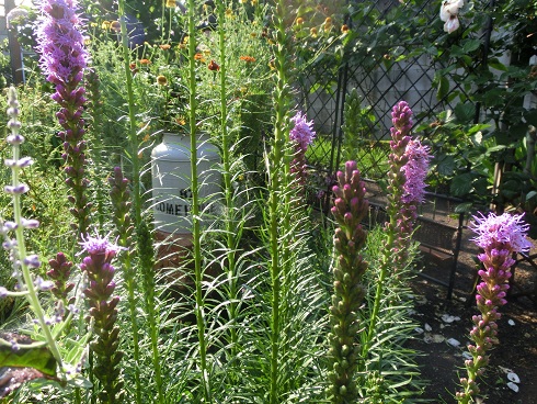 丈が80cmくらいになり、直立する球根植物のリアトリスです。頭頂部から順番に、ツボミが割れて、ほやほやした花びらが出てきます。面白いですね~背景には、薔薇ニュードンの二番花がチラホラ咲いています。未明まで降っていた雨の雫を溜めて、とっても優しい色合いの薔薇です。頂いていたお手紙の返事がすっかり遅くなり、今朝こそ投函しなくては、とポストまで行きました。未明まで雨が降っていたので、庭の水やりはさぼることが出来ます。なので、ポストからぐるりと回り道をしながら散歩をしました。帰り道、友人のKさんちの前を通ります。まだ六時、外からでは庭にいるかどうか分からないのですが、「お早う」と小さな声で言ってみたら、「どうぞ」と返事。庭の奥のスモークツリーが雨を含み、朝陽にキラキラ輝いています。スモークツリー。花が煙のように白くふわふわ、空中に浮いています。植物って面白いですね~。斑入りの擬宝珠を分けて鉢に植えてあるのをくれました。擬宝珠は、種類が多いですよね。うちにも、何種類も植わっているんですよ。だから、「えっ、これ、うちになかったっけ?」と聞いたら、無いと思うよ、とはっきりした返事でした(笑)。貰った鉢を覗いていたら、小さなジャコのような魚が二匹、土の上に。彼女は、大きな水がめの中に、メダカを育てているのですが、昨夜の大雨で、水がめからあふれ出て、隣の擬宝珠の鉢に落ちたみたいです。あら大変と、大事にしている赤いメダカを探したら、水がめの中で、まだ数匹が元気に泳いでいました。朝のハプニングでした。そうそう、貰った擬宝珠を、うちにあるのと比べてみたら、似てはいますが、斑の色が違っていました。私は、自分の庭でもよく分かっていなかったのに、彼女はすごいわ~。 昨日のアクセス数 696 花ブログランキングに参加しています応援のクリックをよろしくお願いします。 現在のランキング 5 位