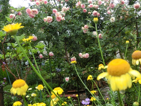 赤いベルガモットと薔薇ホットココアが、赤い景色を作っています。雨の後の花の色は、ひときわ鮮やかで美しく感じます。ベルガモットは別名タイマツ草とも言いますが、ピンクのベルガモットよりも赤のほうが、より松明の感じが出ています。長い期間咲いてくれるホットココアは、大好きな薔薇。う~ん、好きだわ~、いい色だわ~。ドライフラワーが好きで、しょっちゅうぶら下げて乾燥させています。自分の庭の花だけで作る、ということに拘っています。カラカラに乾いたものを集めてみました。ダイヤーズカモミール、カスミソウ、ラベンダー、薔薇、ベルガモットなど。昨日の雨の一日、家の中で、ああでもないこうでもないと、ドライフラワーの花束を作ってみました。白い壁をバックに天井からぶら下げました。下から見上げてみたらこんな感じです。黄色のダイヤーズカモミールが、思った以上にいい感じです。 昨日のアクセス数 939 花ブログランキングに参加しています応援のクリックをよろしくお願いします。 現在のランキング 5位