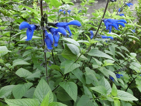 メドーセージ。セージ類は大体が丈夫ですが、その中でも特に強健です。足元が暗いほどに茂っているので、写真を撮ったあとは、半分は抜きます。濃い緑の葉に、暗褐色な茎、濃いブルーの花。おしゃれな組み合わせです。毎日、繁った樹を切ったり、増えすぎの植物を抜いたり、ゴミがいっぱい出ます。溜ってしまうと大変なので、ゴミ出しの日には必ず出します。朝五時半、車に大きなゴミの袋を、今日は四袋積んでゴミ置き場へ。Kさんに出会います。お互いに車なので、手を振って挨拶します。これは、メドーセージより繊細な感じがするブルーセージ。とっても可愛いチェリーセージ。大株になり、小道にはみ出すので、バッサバッサと適当に切っても、平気な顔して、また伸びてくる丈夫さです。ボックセージ。透き通った空色の花が、爽やかに目立っています。ボックセージは、高さ1.5メートルほどにもなり、不思議なことに、そんなに高くても、添え木をしなくても自立しています。地中で茎を伸ばし、離れたところへ芽を出したのがあったので、違う場所に植えてみました。Kさんがやってきます。大体毎日、お互いの庭を行ったり来たりしていますよ。昨日頂いたギボウシの植え場所を相談します。ああでもない、こうでもない。これが朝の六時台の話ですから、田舎の朝は早いですね~。 昨日のアクセス数 877 花ブログランキングに参加しています応援のクリックをよろしくお願いします。 現在のランキング 5 位
