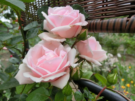 ツル薔薇の「ニュードン」です。 この儚げなピンク色、素敵ですね~。シルバーピンク、というそうです。初心者向きで、非常に丈夫です。トゲは鋭いですが。それに虫もあまりつかない気がします。遅咲きの種類なので、これからが本番です。裏側に回り、庭の方を覗くとこんな感じになります。ニュードンと同じフェンスに絡まっているブラックベリーです。ブラックベリーも非常に丈夫で、繁殖力も旺盛なので、放っておくと薔薇の領域も犯して、収拾がつかなくなる恐れがあります。根元から、何本も立ち上がってきますが、私は二本だけ残す、と決めています。勿体ない、可哀想な気がしますが、ある程度出来上がってしまった庭をすっきり保つには、いつも言いますが、これからは、抜いたり、切ったり、除いたりが欠かせません。ブラックベリーの花は、一日花なのかしら、すぐに散ってしまい、あとにはもうグリーン色の実ができつつあります。だんだんに紅くなり、黒く熟したら、生食したり、ジャムにしたりできます。お客さんとの会話。「庭を維持するのは大変でしょう?」「そうですね。これ以上はもう増やしません。 むしろ、抜いたり、切ったりして、整理することをしようと思うんですよ」「公園とかが綺麗なのは、それが大事みたいですよ。 と言っても、うちはねじり花が育っているだけで、草ぼうぼうなんだけれどね(笑)」「ねじり花、可愛いですよね。私、何回か植えたけれど、ダメにして合わないみたい」「うちは、ねじり花だけは、年々増えていくんですよ。 明日、鉢に植えて持ってきますよ。」アハハ、笑ってしまいますね~。もう植物は増やさない、という話をしていたのに、いつの間にかまた増えることに。 昨日のアクセス数 946 花ブログランキングに参加しています応援のクリックをよろしくお願いします。
