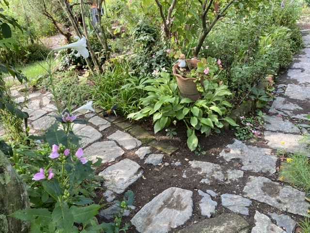 今朝、草抜きと掃き掃除した小径です。左側にたくさん出ている秋明菊の一輪目が咲きました。秋の気配がちょっとだけ感じられる今朝の庭、最初に咲いた秋明菊を見て、天変地異の多い今、去年と同じように、秋は来てくれるのね、と嬉しい気持ちになりました。他の場所の、白いシュウメイギクを見に行ったら、蕾がいっぱい付いていました。秋は、もうすぐですね。奥には、高砂百合。右側には、ギボウシの大株が、たくさんの花穂を立ち上げています。ギボウシに混じり、蛍袋が一輪。ウズアジサイが、再び咲いています。斑入りヤブランの穂も立ち上がっています。 花ブログランキングに参加しています。 応援のクリックをよろしくお願いします。 昨日のアクセス数 3370 昨日のランキング順 5 位
