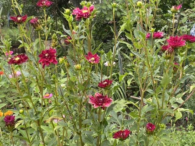 ダリア「女神」。これで一株ですが、たくさんの茎を立ち上げ、たくさんの花を咲かせています。丈は、2メートルにもなります。暗い紅色をしています。カチッとした、硬質的な花びらです。 Nさんが、桔梗を持ってきてくれました。地植えにしたいな。どこに植えようか、と考えるのが楽しい時間です。ちょうど牛乳プリンを作っておいたので、二人でお茶にしました。牛乳プリンに、自家製のブラックベリージャムを。ブラックベリージャムは、味が濃く、色が綺麗で、最高です。ジャムのこと、あまりに美味しい、と言ってくれるので、「パンに塗って食べてみる?」と聞いたら、「ちょっと食べたい」ですって。(笑)時間は、夕方の四時、笑いながら二人で食べました。クリームチーズを乗せると、もっと美味しい。食べる時も、話すときも、マスクをしています。Nさんは家族五人で暮らしているので、「私が来るのは、チマミさんのほうにリスクあるよね」と言い、ちゃんと分かっているので、助かります。分かっていても、たまのおしゃべり、たまのお茶、しょうがないのかな、と思います。Nさんの帰った後は、換気もしました。やりすぎ?実際のところは、どれが正しいのか。来週は、娘一家が来るようですが、抗原キットを購入したので、検査してから来るとか。それも、その時だけの話だから、どうしたらよいのか分からず、お任せです。 花ブログランキングに参加しています。 応援のクリックをよろしくお願いします。 昨日のアクセス数 3202 昨日のランキング順 6 位