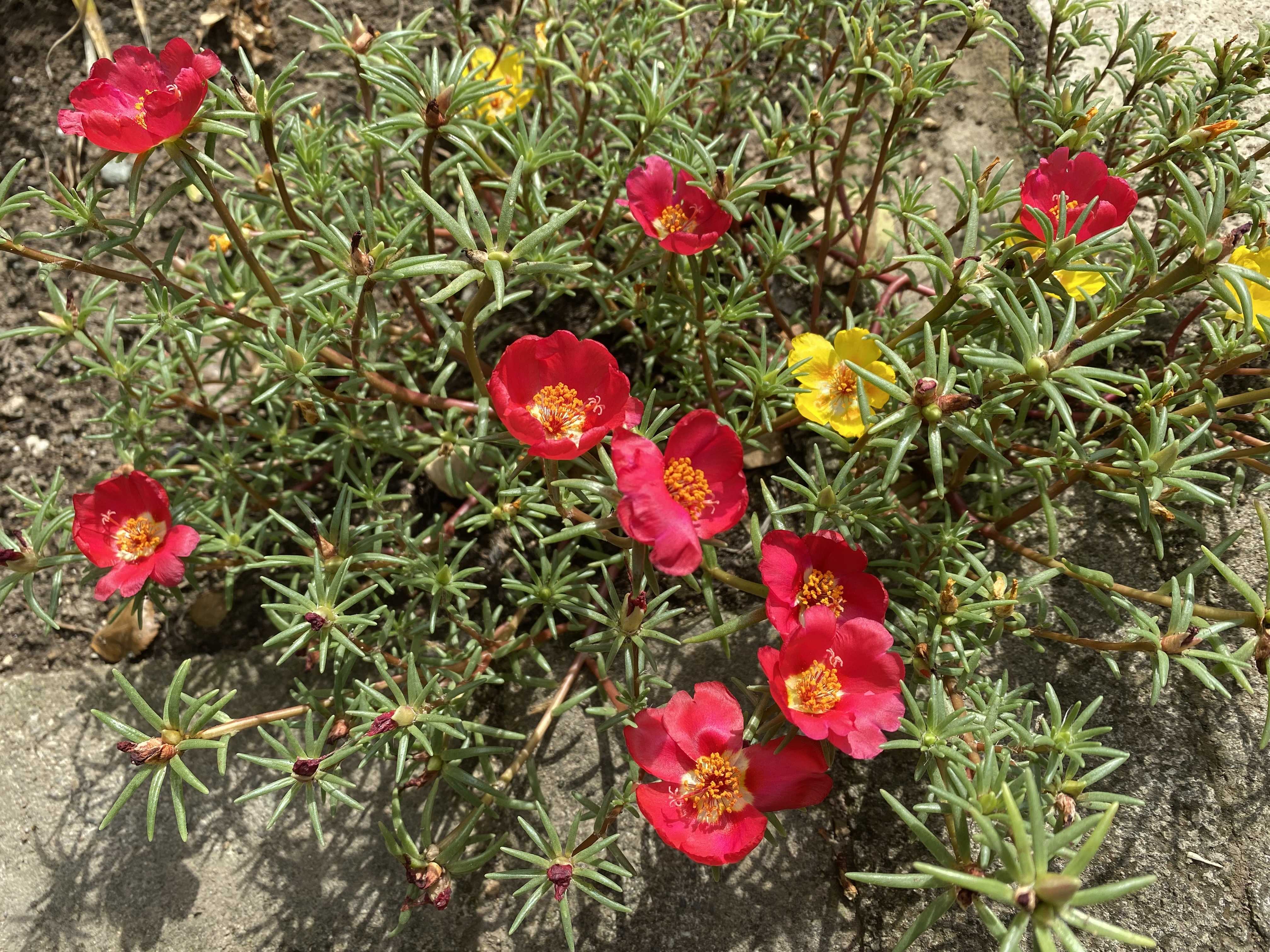 松葉ボタンは、本当に丈夫ですねー。猛暑に加えて、まったく雨が降らないのに、ニコニコ元気に笑って咲いています。その中でも一番、数多く咲いているのが、赤と黄色。レンガや敷石の隙間、どこにでも顔を出しています。最近になって、ピンク色が咲き出しました。薄いピンク色も。白色があれば、もっと嬉しいのだけれど。Sさんから電話。最近の行動や、出来事を逐一報告してくれるので、長電話になってしまいます。(笑)考え方が似ているし、交際範囲が広い人なので、ためになる話しが多いし、有難い存在の友人です。来週のランチは、「我ん家」を予約してあるし、10月に入ると、「エスカフェ」のマスターの、ミニコンサートがあるし、先に予定があるって楽しみだね、と話し合います。電話終わってから、そういえば、「エスカフェ」のブログに、「河内晩柑」のパフェあります、と出ていたな、と思い出しました。7月に、今年最後の河内晩柑です、と言われて、来年までサヨナラね、と美味しく頂きましたが、ブログによると、ひょんなことから仕入れが出来、好評につき、無くなるまで、パフェやります、と。Sさん、この河内晩柑パフェが大好きで、食べれないのを残念がっていたので、話したら、きっと行きたがるだろうな。それぞれに予定があるし、会える日が限られるので、行けないのに、話すのもどうかな、と思案中です。(笑) 花ブログランキングに参加しています。 応援のクリックをよろしくお願いします。 昨日のアクセス数 1283 昨日のランキング順 5 位
