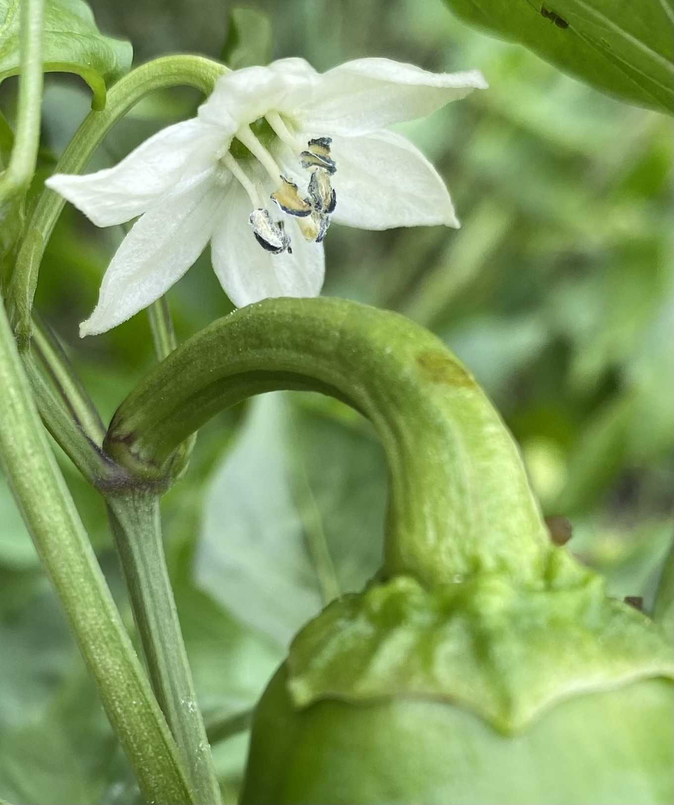 ピーマンの花。白い星形をして、雌蕊に紫色がちょっぴり。なんて、おしゃれで清楚な花でしょう。私のささやかなミニミニ菜園に、ツヤツヤとしたピーマンがいくつか生っています。あれ?これは何? 一本だけのシシトウです。そう言えば、ピーマン苗と一緒に植えた気がします。そんなあやふやなくらいに、放任状態でした。今朝は、寒いほどに涼しくて、ゆっくりと収穫出来ました。咲いている花が、ピーマンの花にそっくりです。こんなに収穫出来ました。ナスとシシトウで、煮浸しにしてみました。冷やしてから食べましょう。 花ブログランキングに参加しています。 応援のクリックをよろしくお願いします。 昨日のアクセス数 1138 昨日のランキング順 6 位