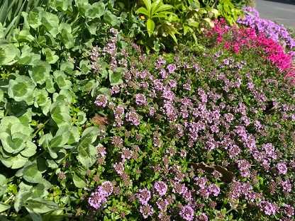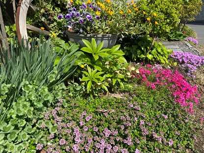 玄関です。奥はシバザクラ。手前は白色クローバー。