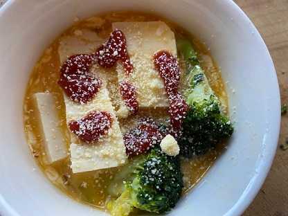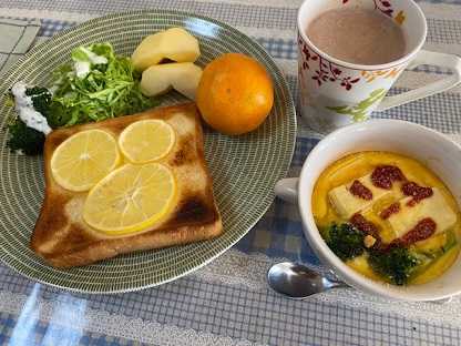 ココア牛乳、サラダ、蜜柑、ココット風。