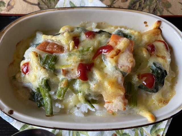 ピザ用チーズを乗せて焼く、簡単ドリアにしました。