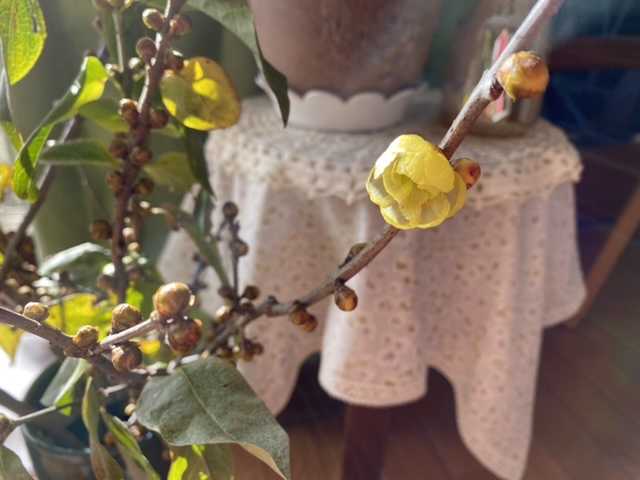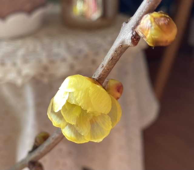 花瓶に挿しておいた蝋梅のツボミが膨らんでいます。