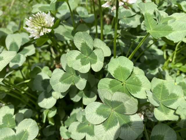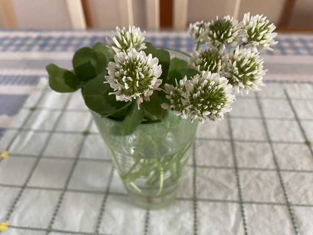 テーブルにシロツメクサを飾る。いいね、可愛い。