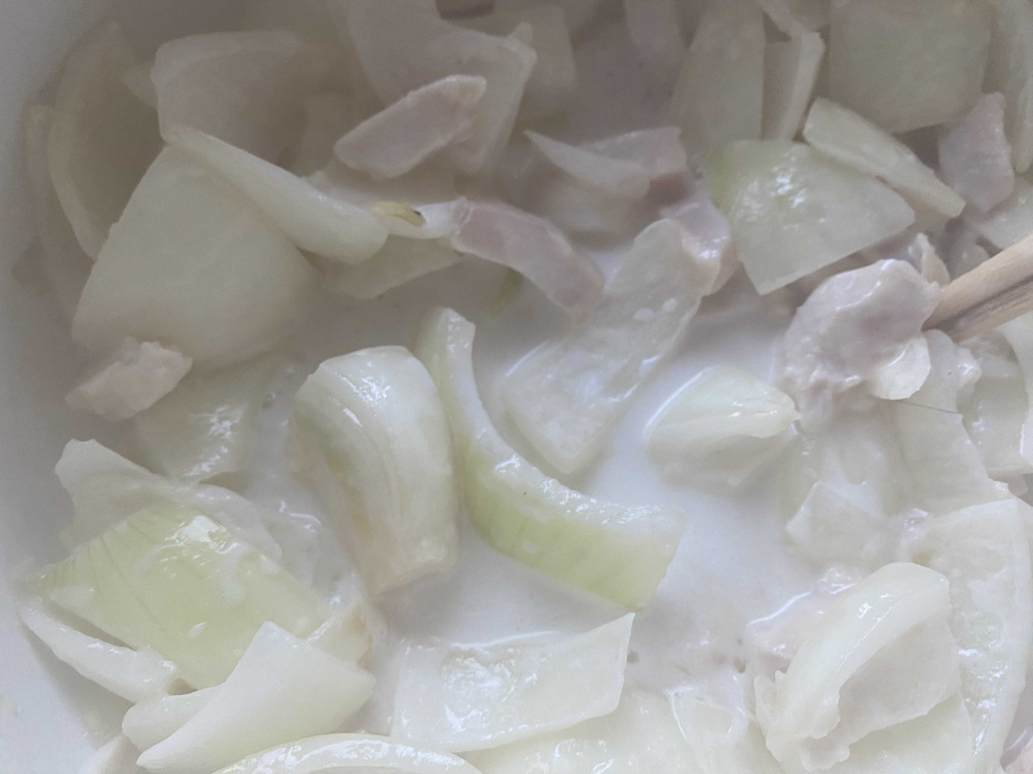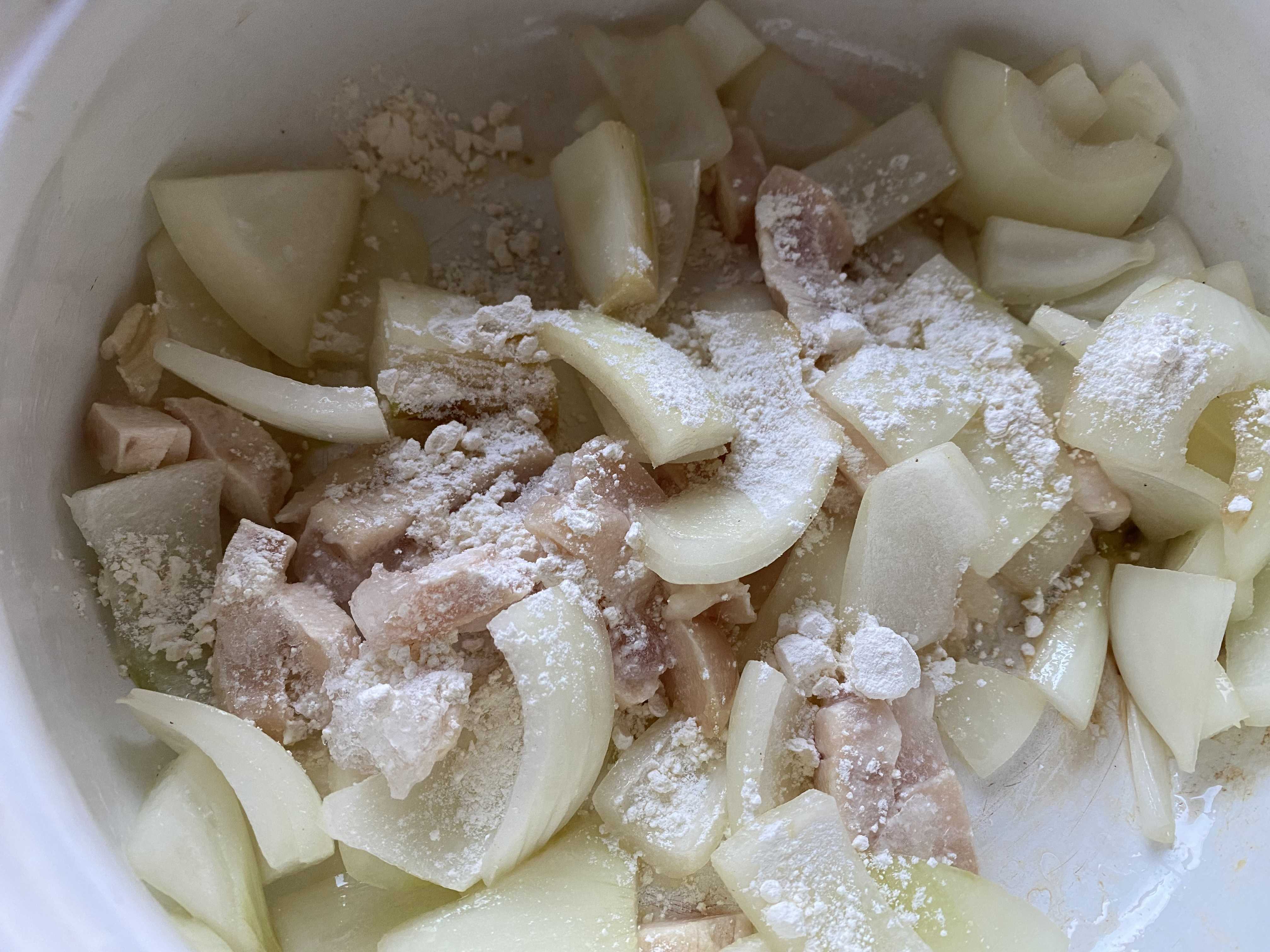 鶏肉、玉ねぎをバターで炒め、小麦粉を振りかけ、
