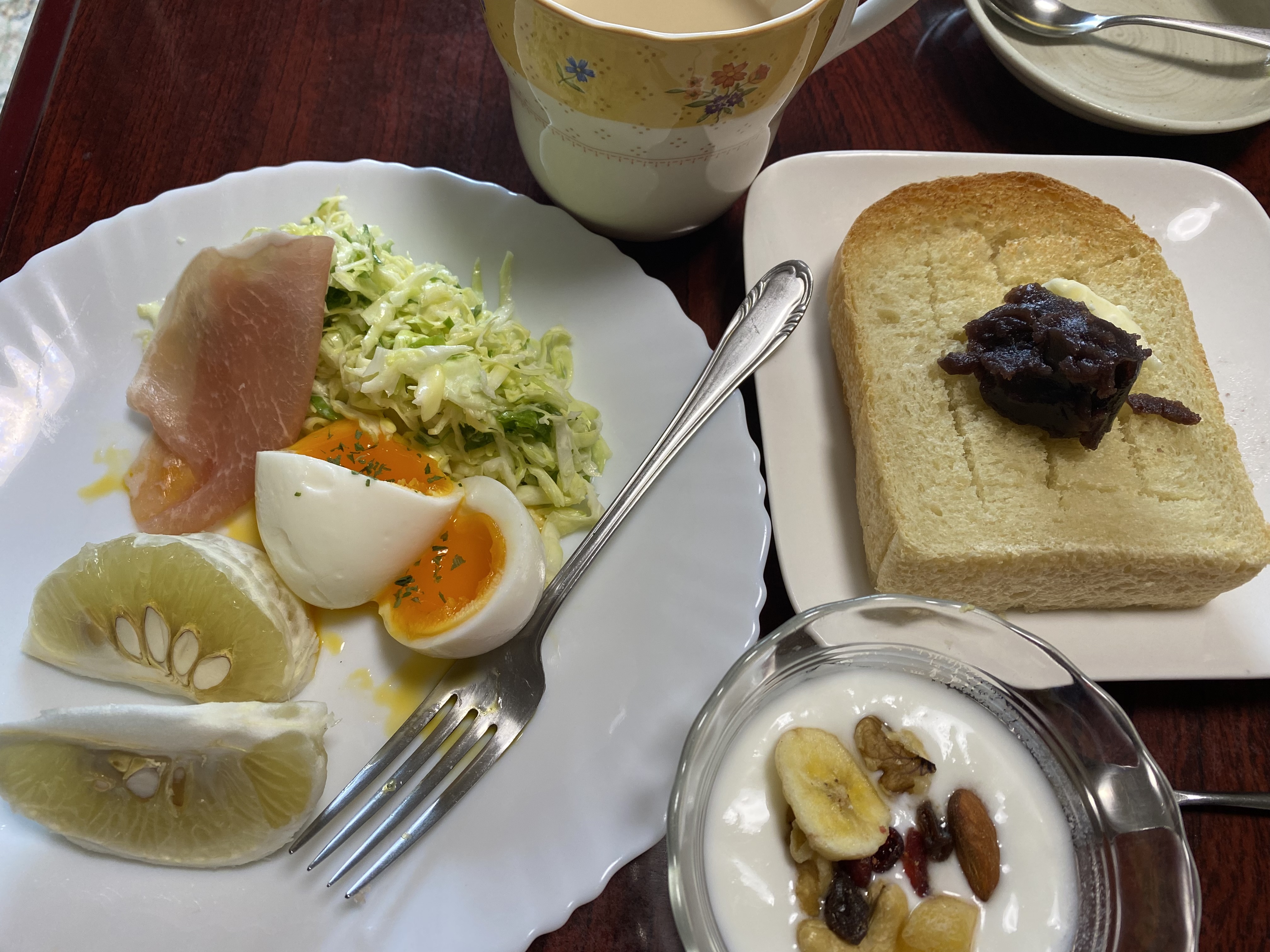 朝食。キャベツ、茹で卵、生ハム、ブンタン?