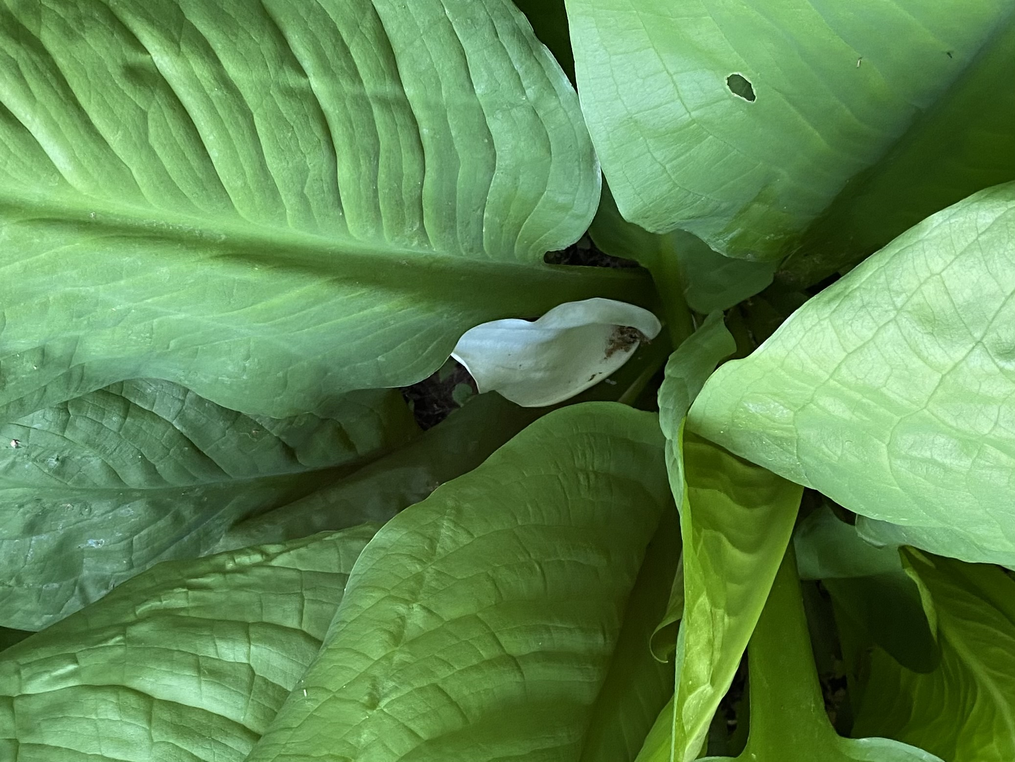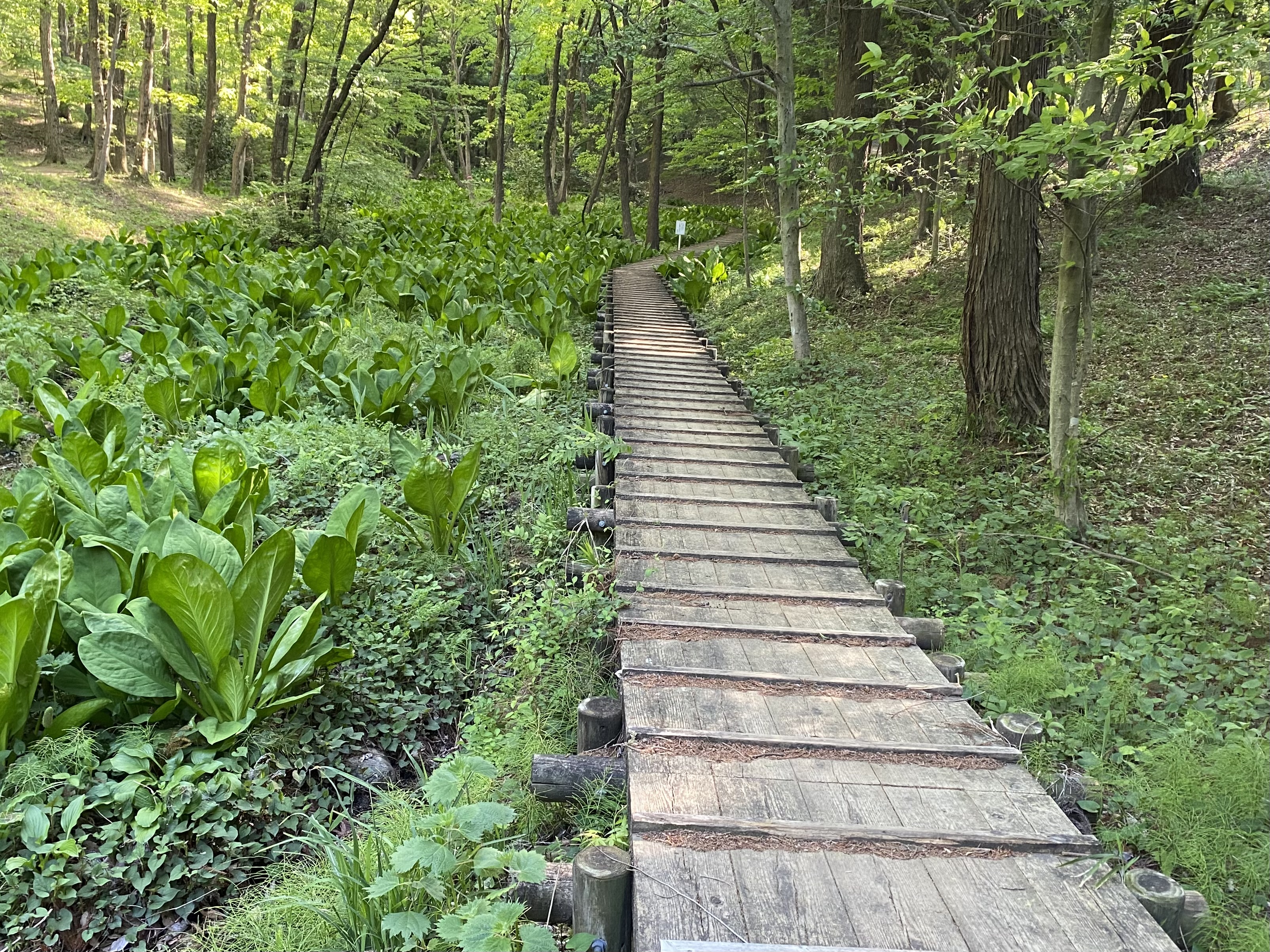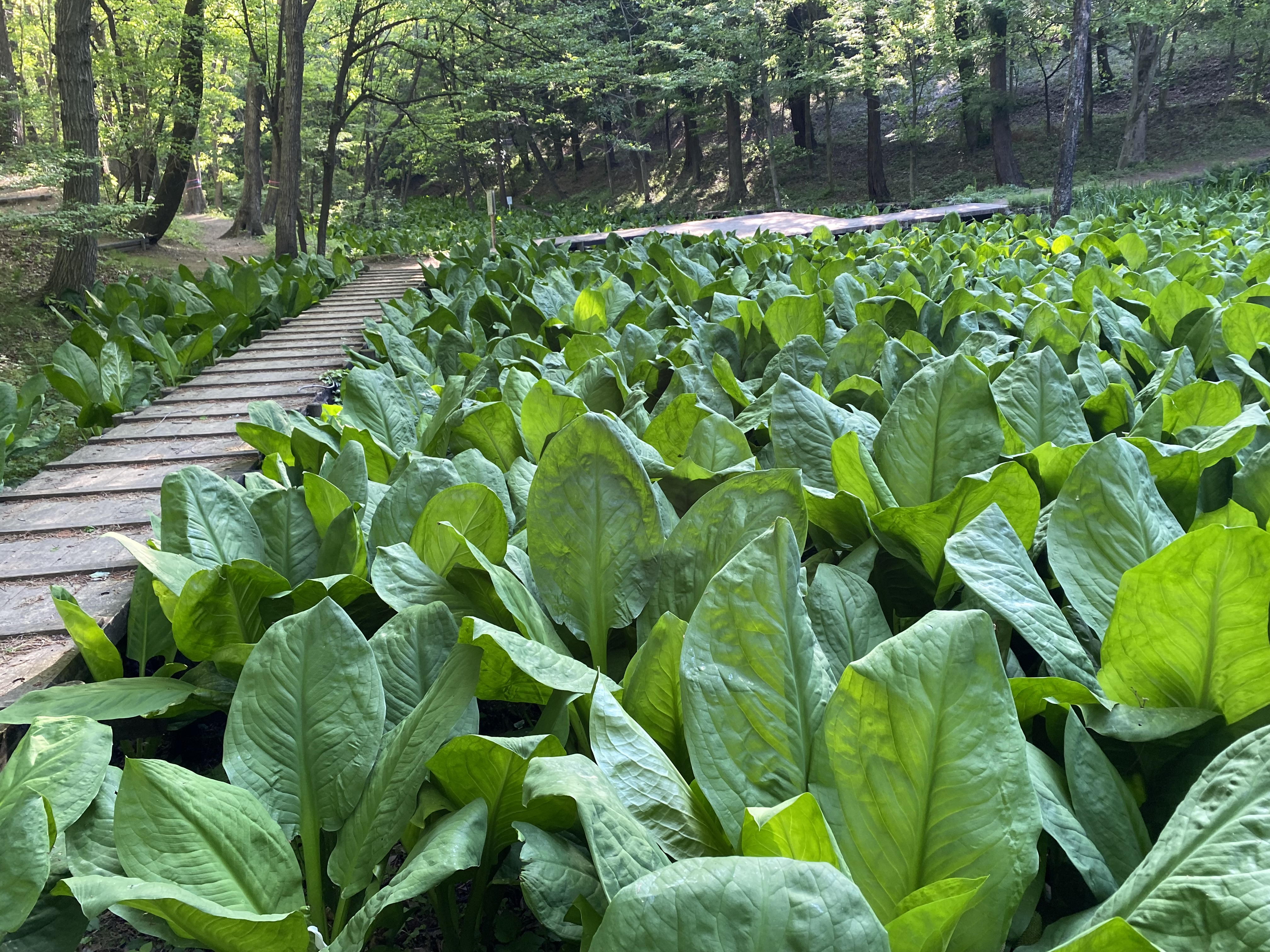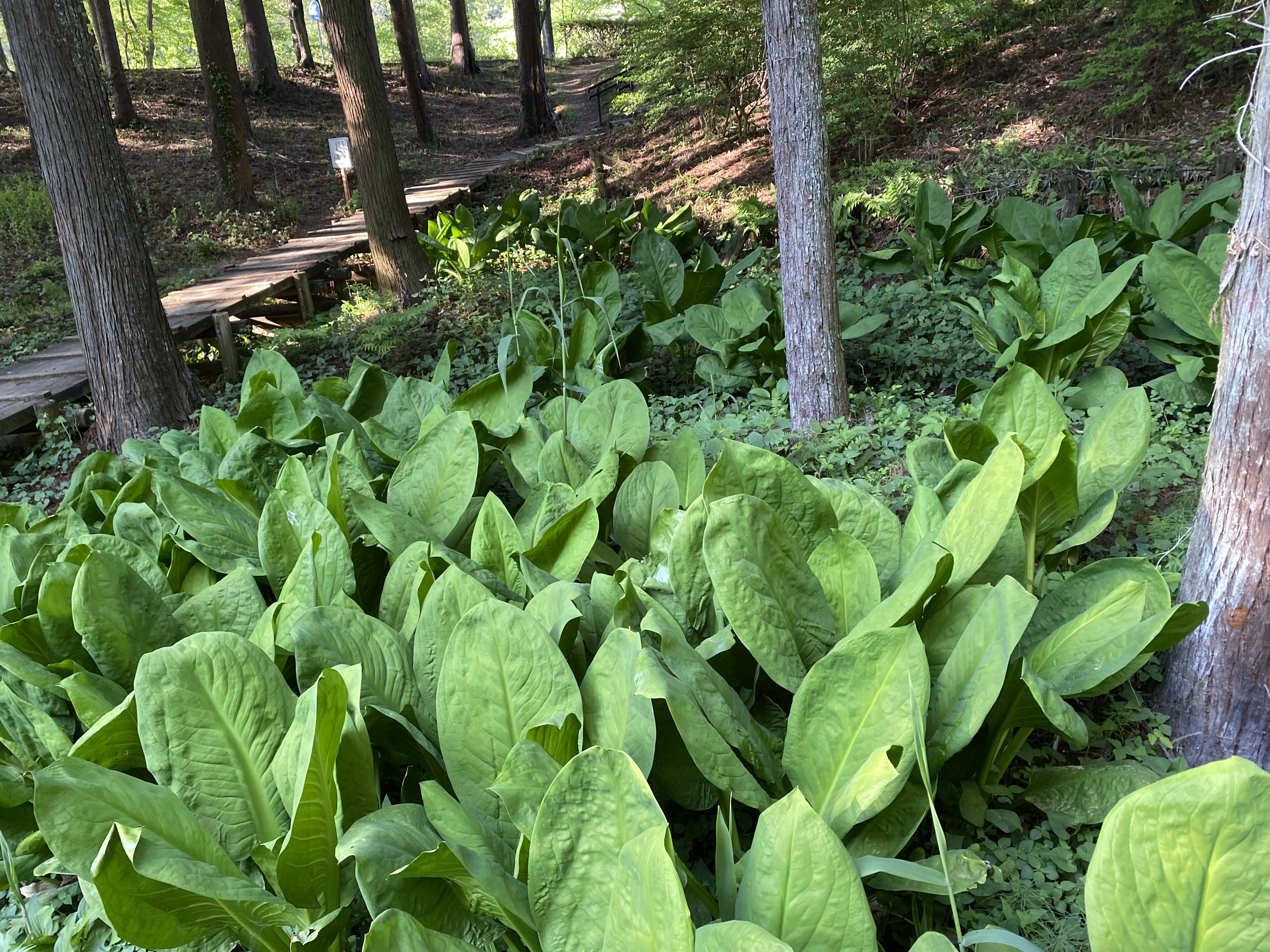 水芭蕉の公園で、一面、大きく育った水芭蕉の葉。