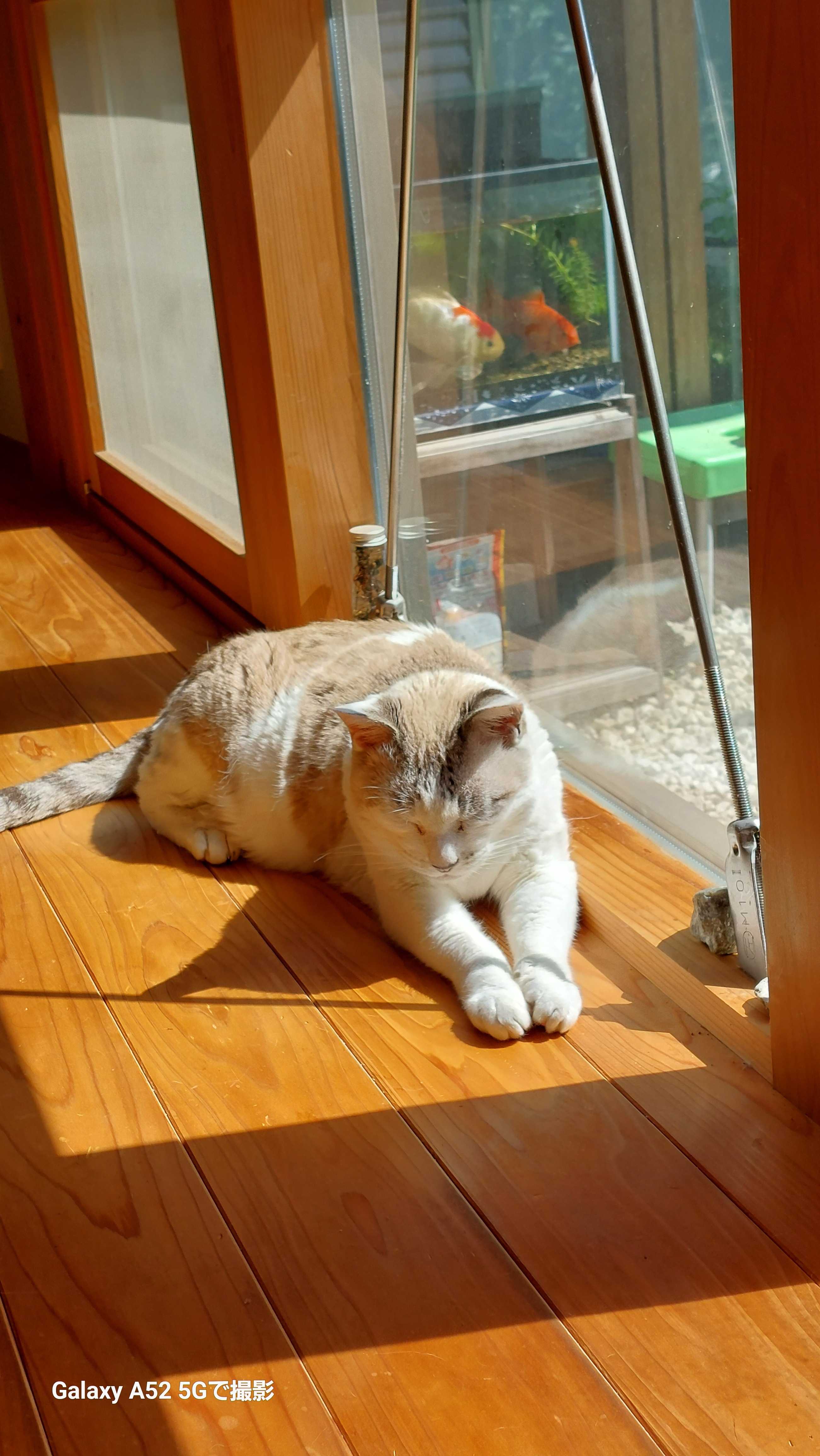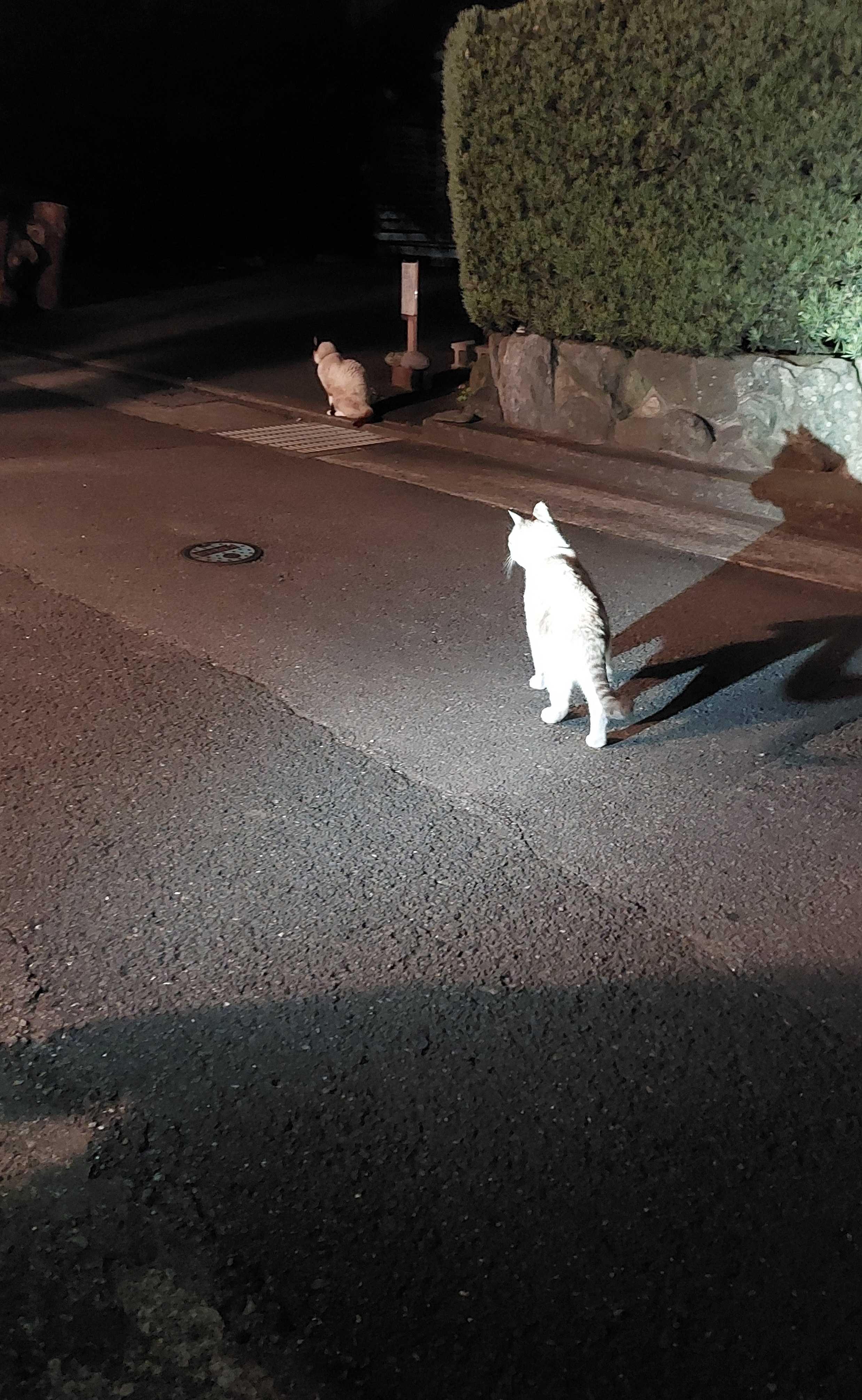 夜の散歩に出てくることがあります。楽しそうです。くうさんの影も面白い。家きの近所を一回りして15分くらいして帰ってきたら待っています。昼間はほとんど寝てばかりの高齢者に。ゆっくり動いてまったり歩いて食べる時と水とトイレに動くくらい。そうそう声は甘えた大きな声になりました。私が寝転がると腹の上にきてべったり甘えます。17歳の今年の夏は猛暑らしいから大変かも。場所とりではなさんを威嚇してるところ。はなさんは動きません。負けます。くうさん、ほんとに弱くなりました。